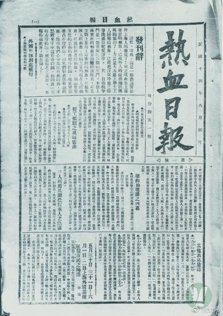6月4日 中国共产党历史上的第一份日报《热血日报》创刊,由瞿秋白主编。这份通俗的政治性小型报纸,每天出版8开4版一张。《热血日报》在密切配合政治斗争、及时宣传报道上海和全国各地反帝反封建的群众爱国运动,坚持正确舆论导向和战斗性的同时,还注重文章的通俗性、群众性和形式的多样性,让一般的工人和市民群众都能看懂。《热血日报》只出了24期,6月29日就被租界巡捕房查封而停刊。它在中国现代革命史和新闻史上写下了光辉的一页。